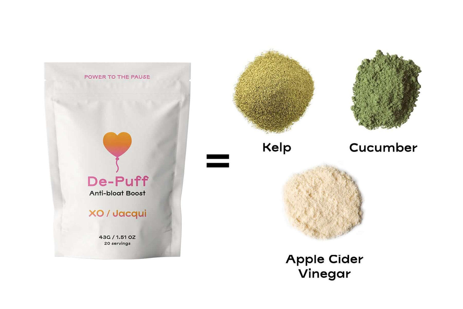 De-Puff Anti-Bloat BoostReducing gas, ease stomach discomfort, and promote a healthy fluid balance in the body. Apple Cider Vinegar improves digestion and accelerates the breakdown of food. Kelp, crucial for proper thyroid function, reduces hormonal fluctuations that contribute to bloating and water retention. Cucumbers provide a cooling effect and are naturally anti-inflammatory and help flush out toxins.