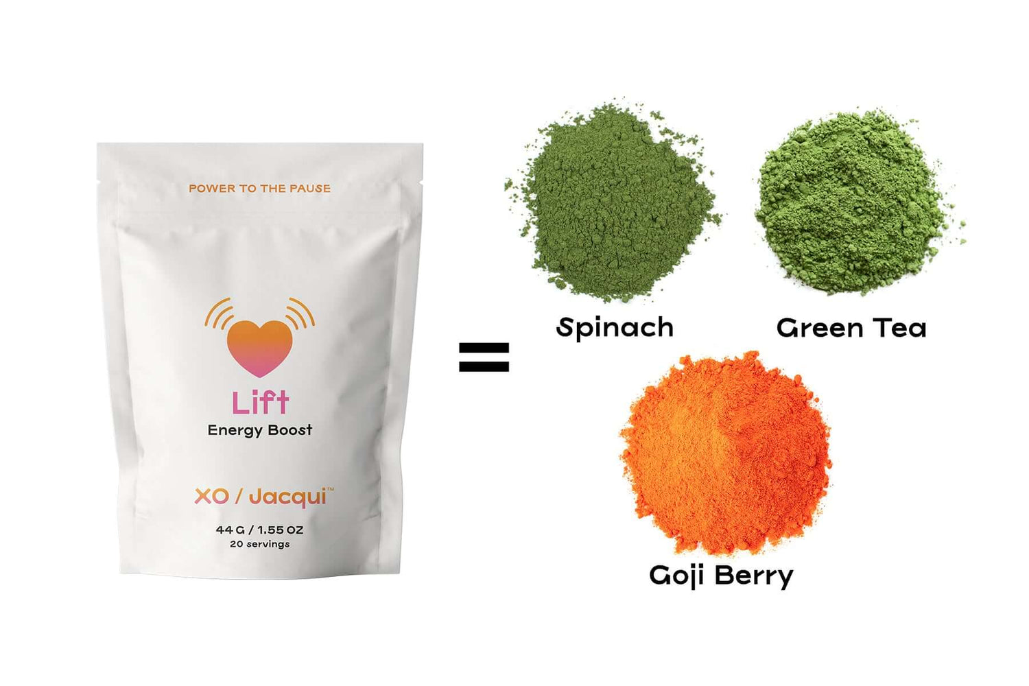 Lift Energy BoostGreen tea boosts metabolism, provides a stable release of energy and is loaded with catechins, antioxidants that protect cells from stress. Goji berries have properties that help maintain stable blood sugar levels, preventing the spikes and crashes that can affect energy. Spinach is high in iron which helps in the proper functioning of mitochondria, the energy factories of cells, and prevents fatigue.